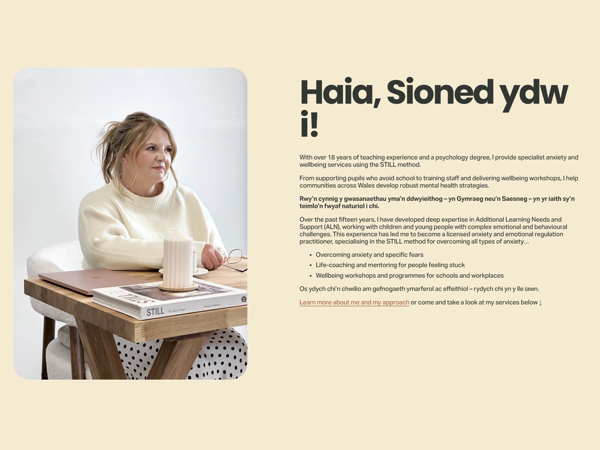Helo, Sioned ydw i, hyfforddwraig gor-pryder a lles emosiynol yn lleol i Fethesda. Rwy’n cefnogi plant, oedolion, rhieni a gweithleoedd i deimlo’n dawelach, yn fwy hyderus ac yn fwy mewn rheolaeth o’u hemosiynau.